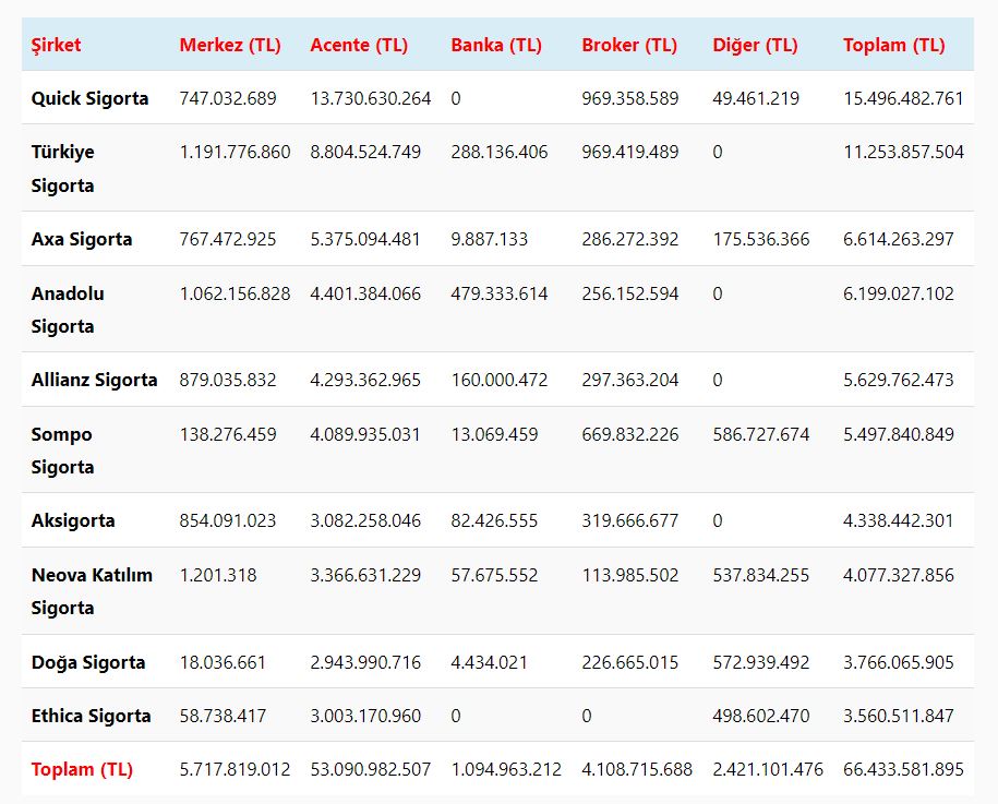 Türkiye Sigorta Birliği tarafından yayınlanan Ocak – Kasım (on bir aylık) dönemine ait trafik poliçesi prim üretimlerinde en yüksek pazar payına ait ilk on şirketin hangi satış kanalı aracılığıyla ne kadar prim üretimi gerçekleştirdiğini analiz ettik. Buna göre ilk on şirkette en yüksek prim üretimi 53 milyar 90 milyon TL ile acente kanalında oldu.