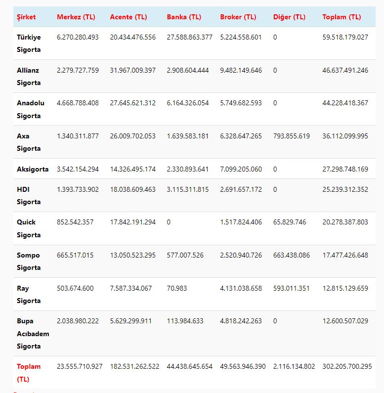 Türkiye Sigorta Birliği tarafından yayınlanan 2023 yılı hayat dışı branşlar prim üretim verilerine göre prim üretimlerinde en yüksek üretim yapan ilk 10 şirket sırasıyla;