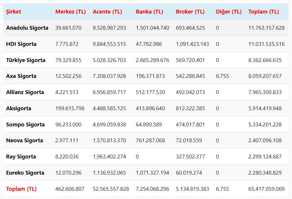 Türkiye Sigorta Birliği tarafından yayınlanan Ocak – Aralık 2023 prim üretim verilerine göre kasko branşı prim üretimlerinde en yüksek üretim yapan ilk 10 şirket sırasıyla;