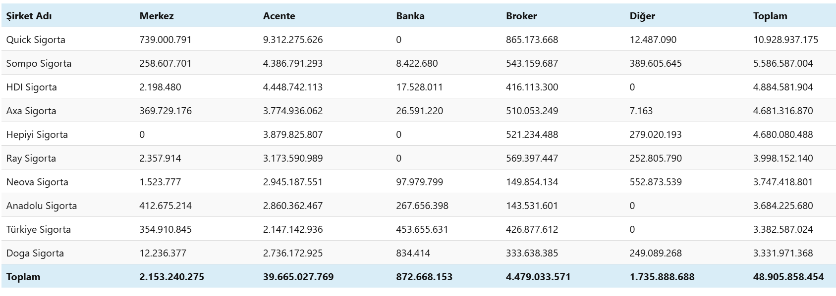 Türkiye Sigorta Birliği tarafından yayınlanan Nisan 2025 dönemine ait trafik poliçesi prim üretimlerinde en yüksek pazar payına ait ilk on şirketin hangi satış kanalı aracılığıyla ne kadar prim üretimi gerçekleştirdiğini analiz ettik. Buna göre ilk on şirkette en yüksek prim üretimi 39 milyar 665 milyon TL ile acente kanalında olurken acenteleri 4 milyar 479 milyon TL ile broker satış kanalı takip etti.