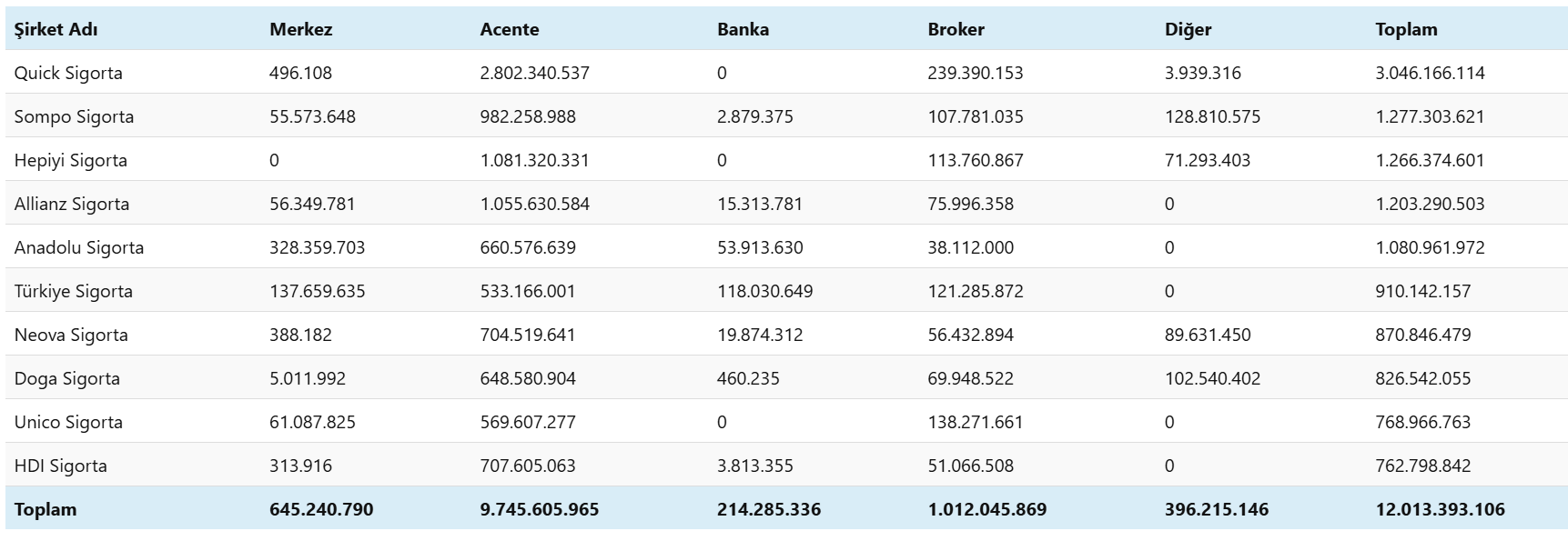 Türkiye Sigorta Birliği tarafından yayınlanan Ocak 2025 dönemine ait trafik poliçesi prim üretimlerinde en yüksek pazar payına ait ilk on şirketin hangi satış kanalı aracılığıyla ne kadar prim üretimi gerçekleştirdiğini analiz ettik. Buna göre ilk on şirkette en yüksek prim üretimi 9 milyar 745 milyon TL ile acente kanalında olurken acenteleri 1 milyar 12 milyon TL ile broker satış kanalı takip etti.