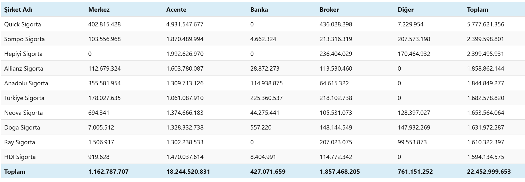 Türkiye Sigorta Birliği tarafından yayınlanan Şubat 2025 dönemine ait trafik poliçesi prim üretimlerinde en yüksek pazar payına ait ilk on şirketin hangi satış kanalı aracılığıyla ne kadar prim üretimi gerçekleştirdiğini analiz ettik. Buna göre ilk on şirkette en yüksek prim üretimi 18 milyar 244 milyon TL ile acente kanalında olurken acenteleri 1 milyar 857 milyon TL ile broker satış kanalı takip etti.