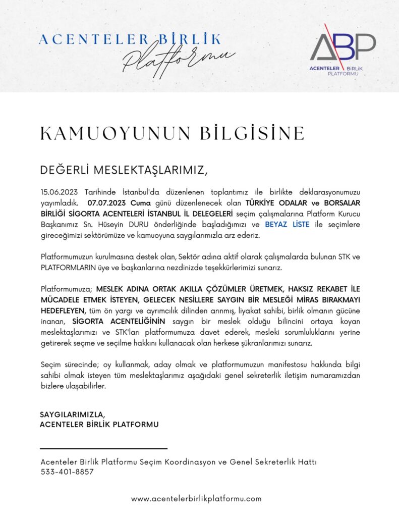 15.06.2023 Tarihinde İstanbul’da düzenlenen toplantımız ile birlikte deklarasyonumuzu yayımladık. 07.07.2023 Cuma günü düzenlenecek olan TÜRKİYE ODALAR ve BORSALAR BİRLİĞİ SİGORTA ACENTELERİ İSTANBUL İL DELEGELERİ seçim çalışmalarına Platform Kurucu Başkanımız Sn. Hüseyin DURU önderliğinde başladığımızı ve BEYAZ LİSTE ile seçimlere gireceğimizi sektörümüze ve kamuoyuna saygılarımızla arz ederiz.