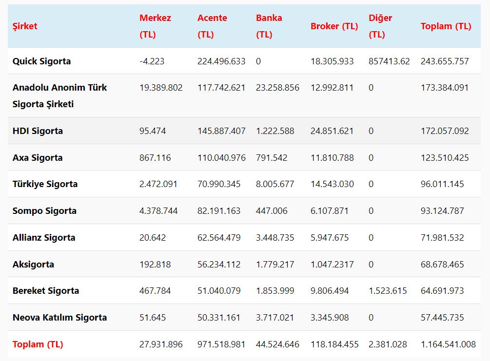 Türkiye Sigorta Birliği tarafından yayınlanan Ocak 2024 prim üretim verilerine göre Motorlu Kara Taşıtları İhtiyari Mali Sorumluluk prim üretimlerinde en yüksek üretim yapan ilk 10 şirket sırasıyla;