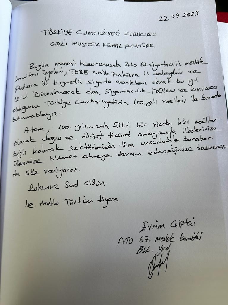 Bugün manevi huzurunuzda ATO 67.Sigortacılık Meslek Komitesi üyeleri, TOBB SAİK Ankara İl Delegeleri ve Ankara ili kıymetli sigorta acenteleri olarak bu yıl 12.si düzenlenecek olan Sigortacılık Haftası ve kurucusu olduğunuz Türkiye Cumhuriyeti’nin 100. yıl vesilesi ile burada bulunmaktayız.