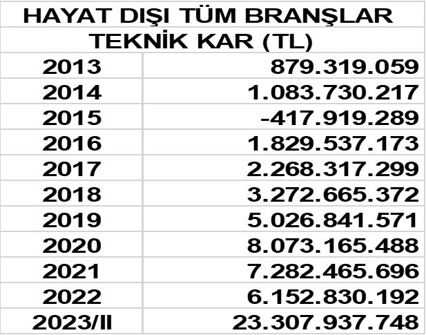 İlk olarak hayat dışı tüm branşların konsolide teknik karlılığını veriyorum. 2023 yılı için veriler yılın ilk altı ayına aittir.