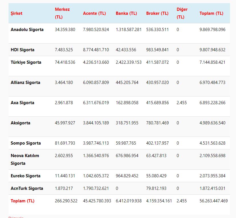 Türkiye Sigorta Birliği tarafından yayınlanan Ocak – Kasım (on bir aylık) dönemine ait kasko poliçesi prim üretimlerinde en yüksek pazar payına ait ilk on şirketin hangi satış kanalı aracılığıyla ne kadar prim üretimi gerçekleştirdiğini analiz ettik. Buna göre ilk on şirkette en yüksek prim üretimi 45 milyar 425 milyon TL ile acente kanalında oldu.