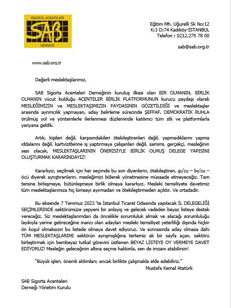 SAB Sigorta Acenteleri Derneğinin kuruluş ilkesi olan BİR OLMANIN, BİRLİK OLMANIN vücut bulduğu ACENTELER BİRLİK PLATFORMUNUN kurucu paydaşı olarak MESLEĞİMİZİN ve MESLEKTAŞIMIZIN FAYDASININ GÖZETİLDİĞİ ve meslektaşlar arasında ayrımcılık yapmayan, aday belirleme sürecinde ŞEFFAF, DEMOKRATİK RUHLA örülmüş yol ve yöntemlerle ilerlenmesi düzleminde katılımcı tüm stk ve platformlarla yanyana geldik.