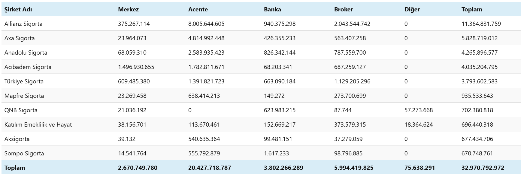 Türkiye Sigorta Birliği tarafından yayınlanan Kasım 2024 dönemine ait tamamlayıcı sağlık (yatarak ve yatarak+ayakta) poliçesi prim üretimlerinde en yüksek pazar payına ait ilk on şirketin hangi satış kanalı aracılığıyla ne kadar prim üretimi gerçekleştirdiğini analiz ettik. Buna göre ilk on şirkette en yüksek prim üretimi 20 milyar 427 milyon TL ile acente kanalında olurken acenteleri 5 milyar 994 milyon TL ile broker satış kanalı takip etti.