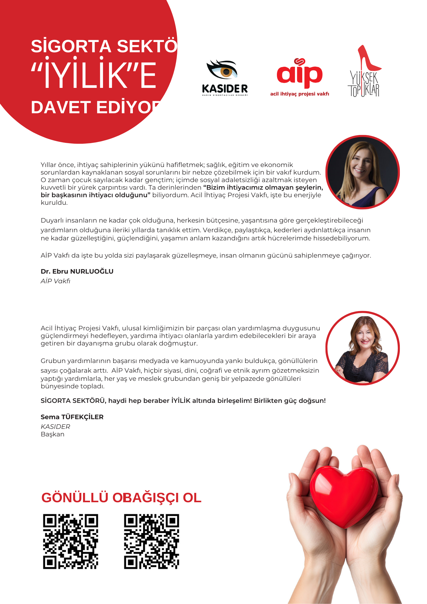 Kadın Sigortacılar Derneği Başkanı Sema Tüfekçiler, “SİGORTA SEKTÖRÜ, haydi hep beraber İYİLİK altında birleşelim! Birlikten güç doğsun!” diyerek sigorta sektörünü iyiliğe davet etti.