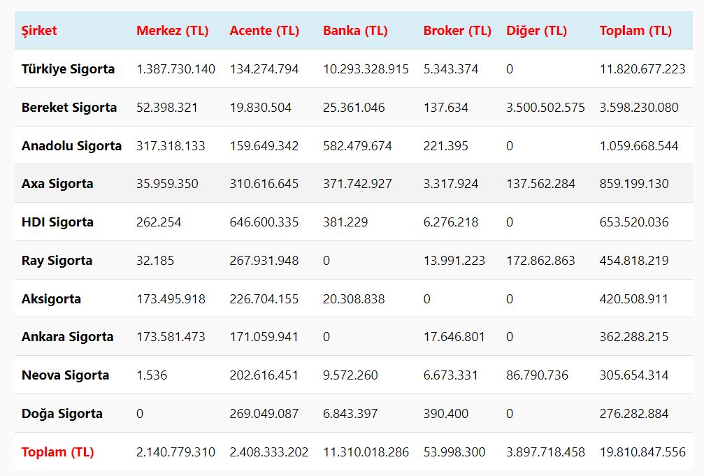 Türkiye Sigorta Birliği tarafından yayınlanan 2023 yılına ait Devlet Destekli Tarım Sigortaları prim üretimlerinde en yüksek pazar payına ait ilk on şirketin hangi satış kanalı aracılığıyla ne kadar prim üretimi gerçekleştirdiğini analiz ettik. Buna göre ilk on şirkette en yüksek prim üretimi 11 milyar 310 milyon TL ile banka kanalında olurken bankaları acenteler 2 milyar 408 milyon TL ile üçüncü sırada.