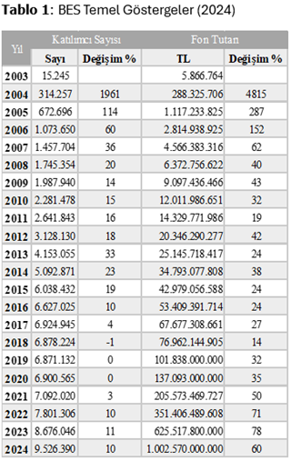 Türkiye’de 2003 yılında hayata geçen Bireysel Emeklilik Sistemi (BES), 20 yılı aşkın sürede önemli bir gelişim gösterdi. Emeklilik Gözetim Merkezi’nin (EGM) 31 Aralık 2024 verilerine göre, sistem 9,5 milyonu geçen katılımcıya ve devlet katkısı hariç 1,003 trilyon TL’yi aşan fon büyüklüğüne ulaştı (1). Tablo 1 de yer aldığı gibi bir önceki seneye göre 2024 yılında katılımcı sayısında %10, toplam fon büyüklüğünde ise %60’lık bir artış gerçekleşti. Devlet katkısı teşviki, otomatik katılım uygulaması, on sekiz yaş altı kişilerin de BES’e giriş yapabilmesinin önünün açılması ile büyüyen sistem, hem bireylerin daha sağlık gelecek planları yapmasını sağladı, hem de ülke ekonomisine ciddi bir finansman kaynağı oluşturdu.  Ancak, bu büyüklüğün arkasında yatan fon yönetimi stratejileri, katılımcıların beklentilerini tam olarak karşıladı mı? Bu soru, sistemin geleceği için kritik bir tartışma konusudur.