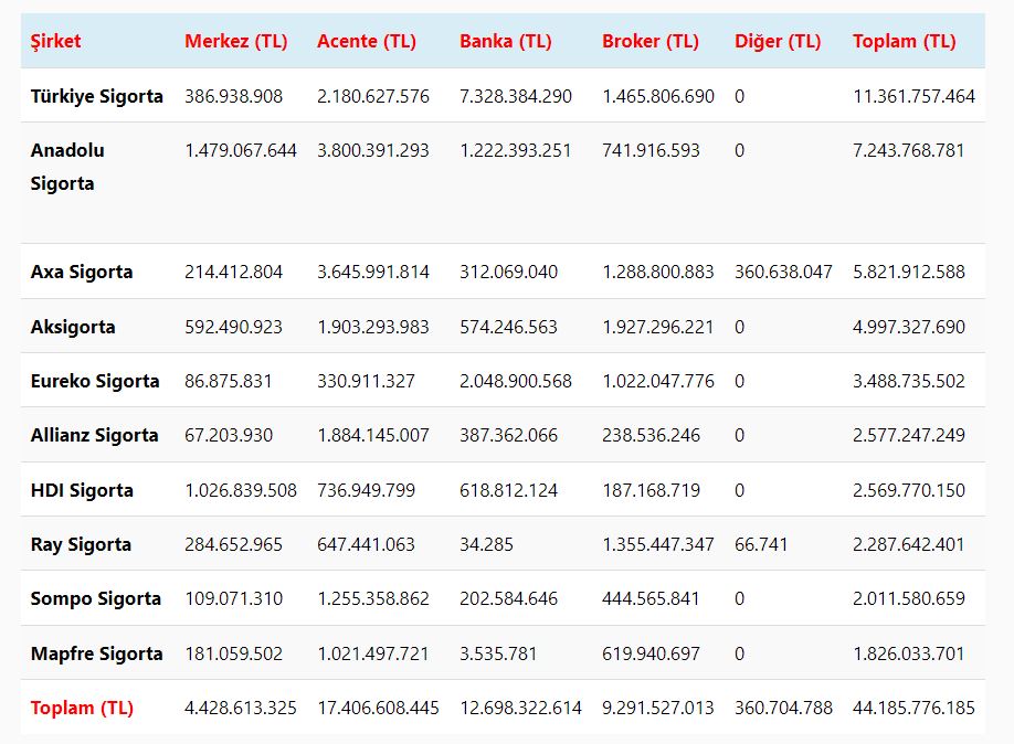 Türkiye Sigorta Birliği tarafından yayınlanan Ocak – Kasım (on bir aylık) dönemine ait Yangın ve Doğal Afetler branşı prim üretimlerinde en yüksek pazar payına ait ilk on şirketin hangi satış kanalı aracılığıyla ne kadar prim üretimi gerçekleştirdiğini analiz ettik. Buna göre ilk on şirkette en yüksek prim üretimi 17 milyar 406 milyon TL ile acente kanalında olurken acenteleri 12 milyar 698 milyon TL ile bankalar takip etti.
